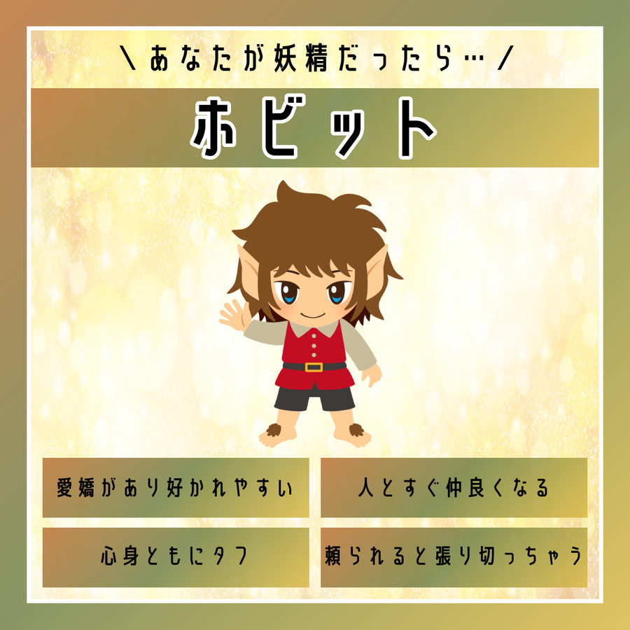 愛嬌があり陽気で、誰からも好かれるあなた。初対面の人とでもすぐに仲良くなれる社交性を持っています。仲間思いで平和を愛し、牧歌的な暮らしを好むホビットのように、あなたも争いごとを避けながらのんびり楽しく過ごしたいと思っているタイプです。