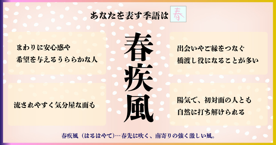 あなたはやわらかな雰囲気で人の心を和ませる、明るく優しい存在。桜咲くうららかな春のように、まわりに安心感や希望を与えます。人との距離を自然に縮めることができ、出会いやご縁をつなぐ「橋渡し役」になることも多いでしょう。