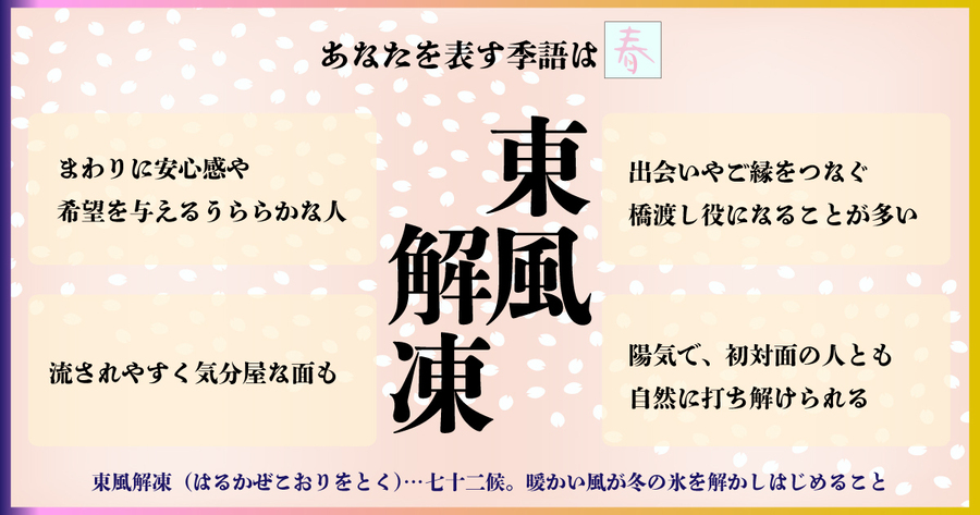 ★【東風解凍(はるかぜこおりをとく)】が出たあなたに、この先に起こることとは…?
