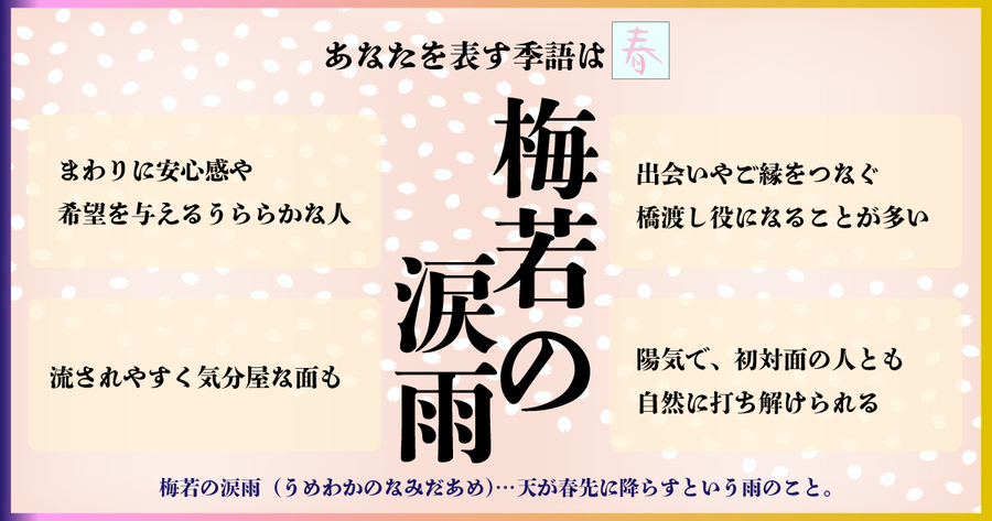 あなたに似合うのは、あたたかい春の季語【梅若の涙雨(うめわかのなみだあめ)】!(解説は下へ)