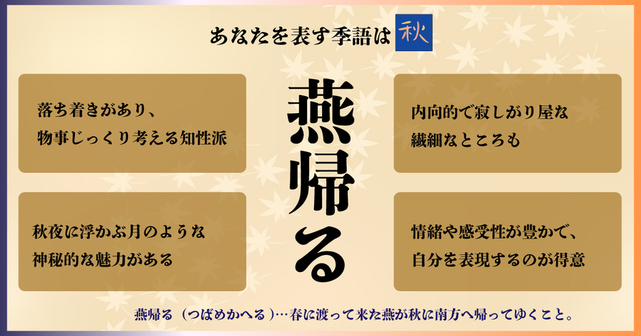 落ち着きがあり、物事をじっくり考える知性派なあなた。秋の夜空に浮かぶ月のように、静かに人の心を惹きつける神秘的な魅力があります。情緒や感受性が豊かで、言葉や芸術で自分を表現するのが得意。静かに人の心に寄り添える優しさも持っています。