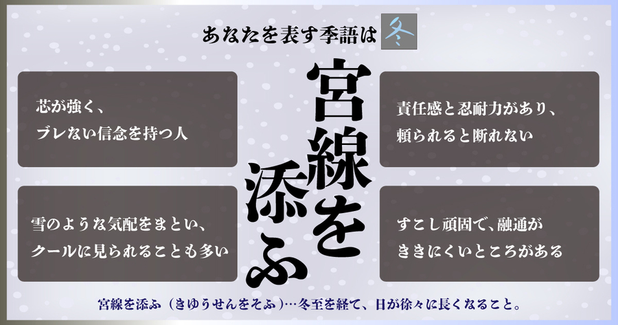 あなたは芯が強く、ブレない信念を持つ人。冬に舞う雪のように凛とした気配をまとい、一見クールに見られることも多いですが、内側にはあたたかな優しさを秘めています。困難な状況でも耐え抜く粘り強さがあり、信頼されやすいタイプです。
