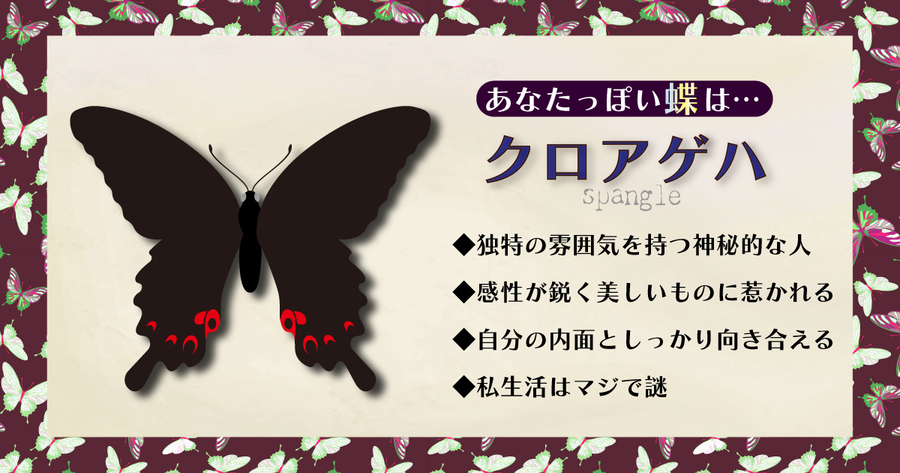 あなたは落ち着いた雰囲気と、どこか神秘的な魅力を持つタイプ。黒く光沢のあるクロアゲハのように、内に秘めた美的感覚やこだわりが強く、独特の世界観を持っています。感性が鋭く、芸術や美しいものに惹かれる一面も。