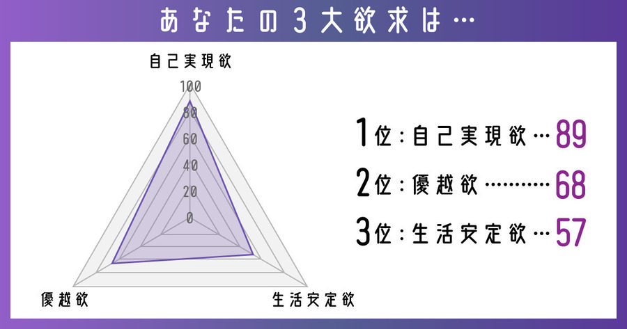 あなたの三大欲求はこんな感じです。真面目で向上心があり、周りから尊敬されることも多いでしょう。ただしもう少し肩の力を抜かないと堅物扱いされちゃうかも!?
