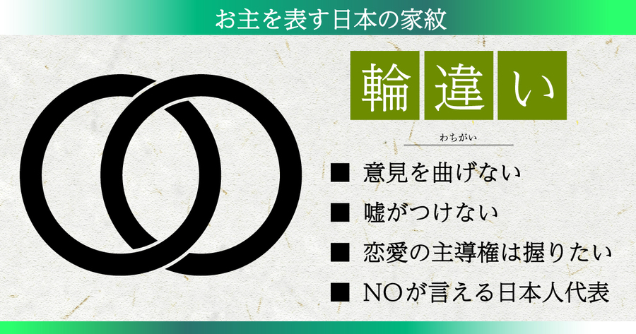 あなたには、輪違いがぴったりでしょう。輪違いとは、理性と煩悩を打ち破る強固なふたつの力を表した紋様です。密教において大日如来の「両界曼荼羅」が由来になっています。また、別個のものが交わっている様から、慈悲の精神を表したものだともされています。