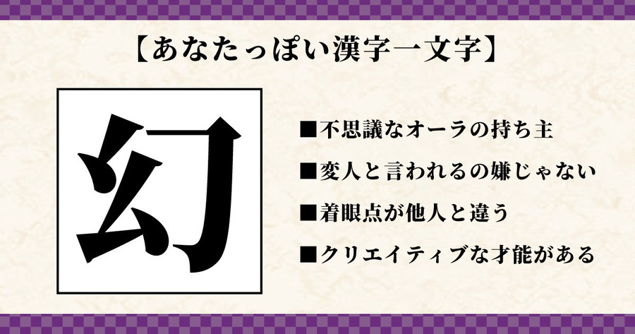 他人とは違う感受性を持つあなたにピッタリなのはこの漢字です。変人と言われることも多く、どこか不思議なオーラをまとうあなた。着眼点が他人と違うので、芸術などクリエイティブさを発揮できる場所に身を置くと成功するでしょう。