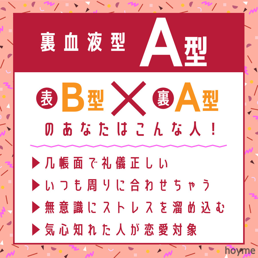 裏血液型は【A型】です。血液型B型で裏血液型A型のあなたは、いつも周りに合わせる八方美人!(解説は下へ)