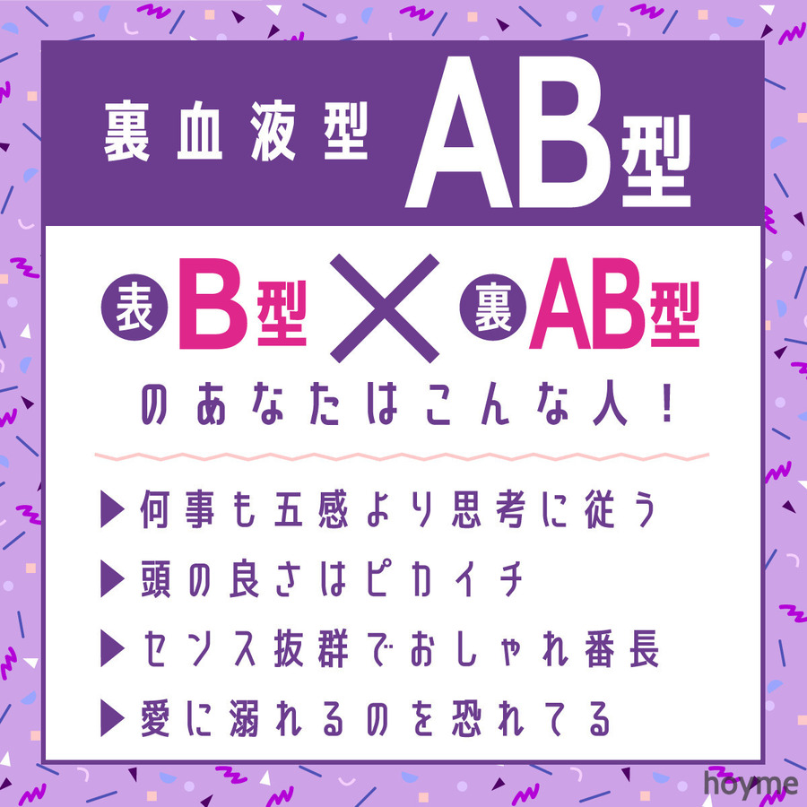 裏血液型は【AB型】です。血液型B型で裏血液型AB型のあなたは、抜群のセンスと頭の良さはピカイチ!(解説は下へ)