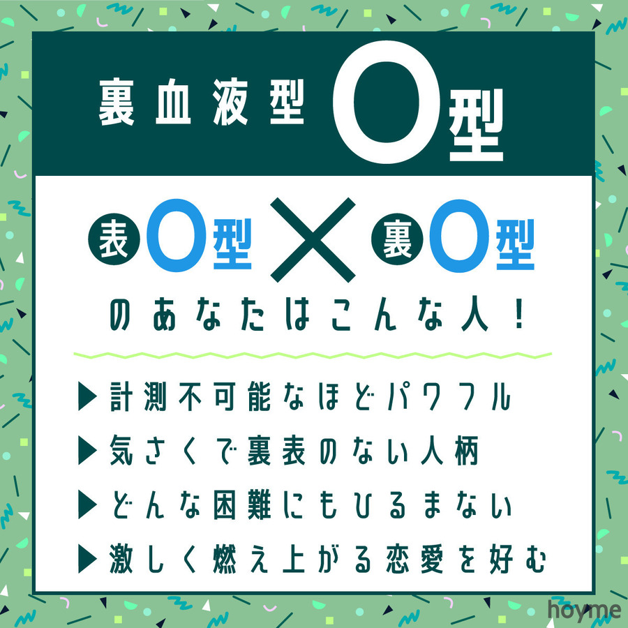 裏血液型は【O型】です。血液型O型で裏血液型O型のあなたは、計測不可能なほどのパワフル人間!(解説は下へ)