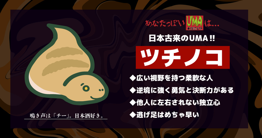 ツチノコは、太鼓の昔から山間部に生息するといわれる未確認生物。各自治体が懸賞金を用意するなど、日本の固有種として人気の高いUMAです。目玉を自在に動かすことができ、広い視野を持つとされているツチノコのように、あなたも多角的な視点を持つ柔軟な人物。変化に適応し、フレキシブルに考えることが得意です。