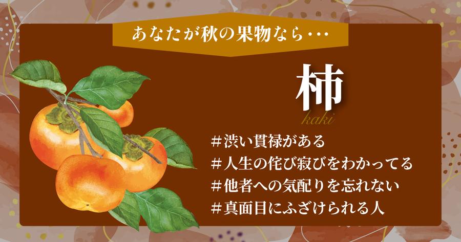 そんなあなたですが、いたずら好きでお茶目な一面も。柿に甘味と渋味があるように、真面目さと遊び心がうまく混ざり合っているでしょう。落ち着きの中にもユーモアや軽やかさがあり、周囲を和ませ、楽しい雰囲気を作り出すことができます。自分自身を大切にしつつも、他者への気配りを忘れないあなたは、多くの人にとって頼れる存在であり、同時に、一緒にいて楽しい人物として愛されることでしょう。