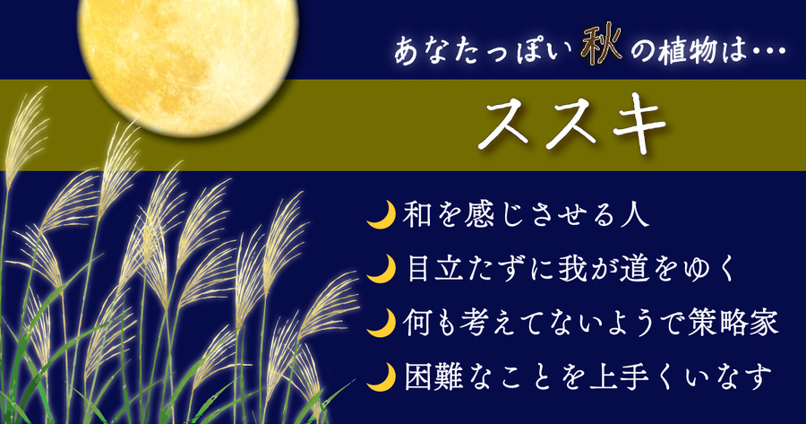 神秘的で生命力にあふれたあなた。秋の七草の一つとして愛され、お月見の風景に欠かせないススキのように、あなたもその場を特別なものに変える独自の魅力を持っています。ススキの空洞の中には神様が宿ると言い伝えられているように、あなたもその静かな外見の奥に神秘的なオーラを漂わせています。どこか捉えどころのない不思議な魅力があり、目が離せない存在。