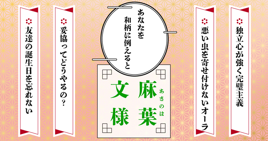 また、邪気を払うと信じられている麻の葉文様のように、あなたも悪いものを寄せ付けないオーラを持つ人。ダメなことはハッキリ断るので、おかしな輩が寄ってくることはありません。