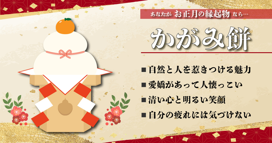 あなたはいつでもポジティブで、落ち込んでいるところを人に見せません。周囲との縁を大切にし、どんな状況でも温かい雰囲気を作り出すことができます。また、鏡餅が「固い物を食べれるくらい丈夫な歯を持ち、健康でいられるように」という、「歯固め」の意味を持つように、あなたもヘルシーなイメージを持っています。