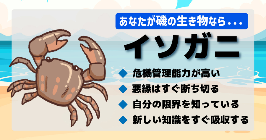 生命力が強く、適度な環境であれば陸上でも生き延びることができるイソガニのように、あなたも適応力と強い生命力を持ち合わせています。トラブルがあっても前向きに取り組む力があり、どんな環境でも自身の力で生き抜くことができるでしょう。ただし、イソガニは汚れた海水や真水ではすぐに死んでしまいます。あなたも、あまり合わない環境下では、パフォーマンスが著しく低下することがあるようです。