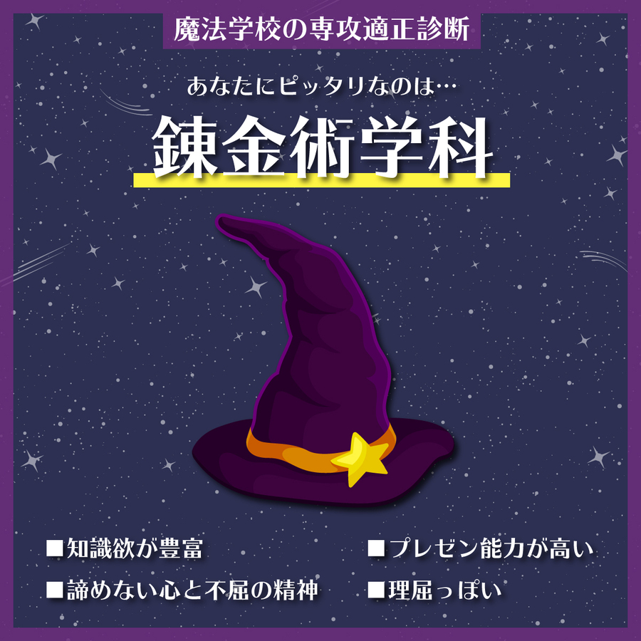 また、研究のための資金集めが必須な錬金術師のように、プレゼン能力が高い一面も。自分の好きなものがいかに素晴しいかを伝える熱意と信念は一級品です。 魔法学校卒業後は、ぜひ立派な錬金術師になってくださいね。